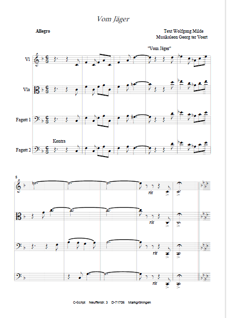 Besetzung: 4 stimm plus Erzähler Vl.,Vla, Fag., Kontrafagott